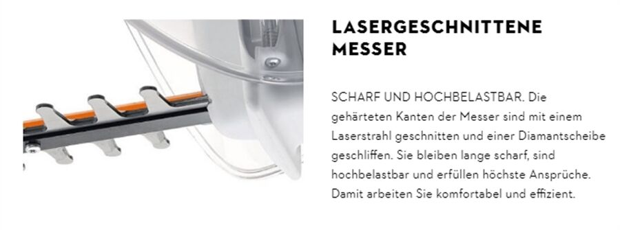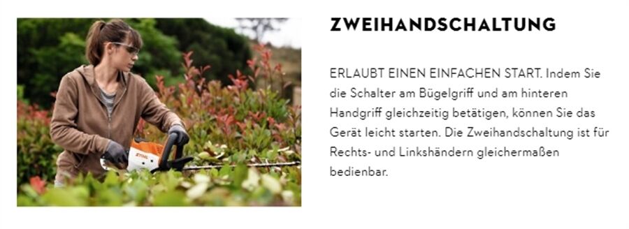 Der Elektromotor, das intelligente Akku-Power-Management und die lasergeschnittenen, diamantgeschliffenen und gehärteten Messer sorgen bei der STIHL Akku-Heckenschere HSA 40 für eine hohe Schnittleistung. Die Zweihandschaltung ermöglicht dabei eine einfache und komfortable Bedienung. Der Start erfolgt durch gleichzeitiges Betätigen der Schalter am Bügelgriff und am hinteren Handgriff. Dieser ist mit Softgrip-Flächen ausgestattet, die in jeder Arbeitsrichtung einen sehr guten Halt unterstützen. Um die Schneidmesser vor Beschädigung bei bodennahen Arbeiten oder Kontakt mit Mauern zu schützen, verfügt die STIHL HSA 40 über einen aufgeschraubten Führungsschutz. Die praktische Aufhängeöse am hinteren Handgriff ermöglicht eine sichere, platzsparende Aufbewahrung.