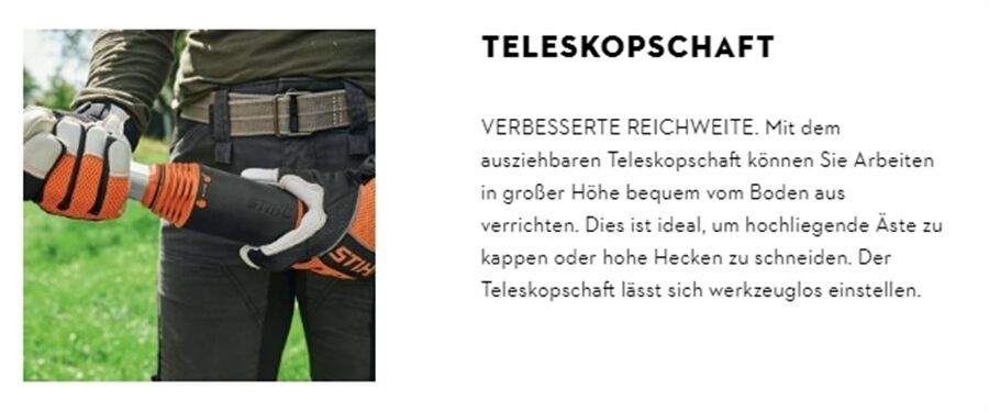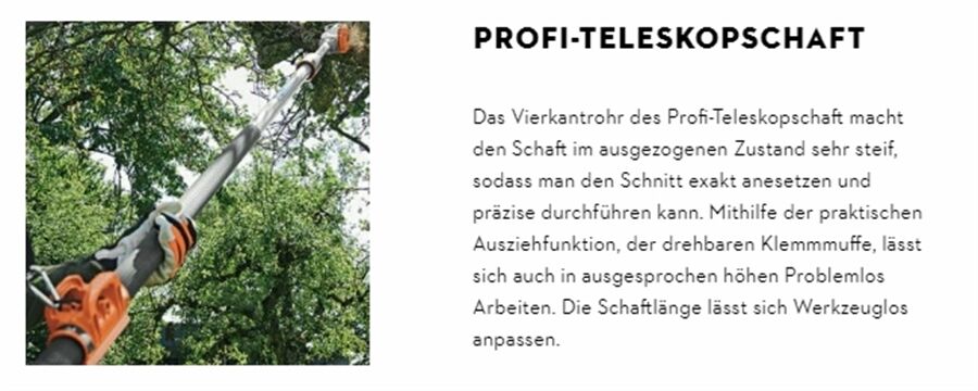 + Längenverstellbarer Teleskopschaft für Arbeiten in großer Höhe