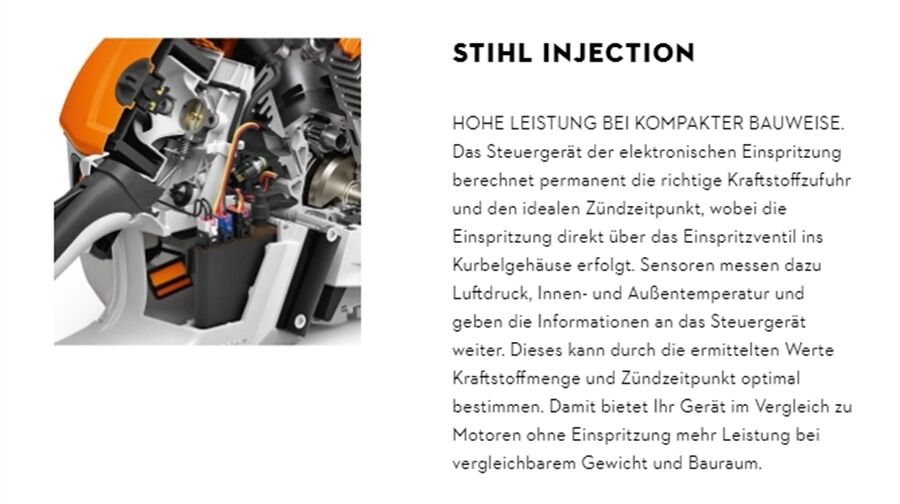 Die MS 500i ist die weltweit erste Motorsäge mit elektronisch gesteuerter Einspritzung. Die innovative Einspritztechnik STIHL Injection gewährleistet eine optimale Motorleistung und ein ausgezeichnetes Startverhalten unabhängig von Höhe und Umgebungstemperatur. Sensoren messen Luftdruck, Innen- und Außentemperatur und geben die Informationen an das Steuergerät weiter. Dieses kann durch die ermittelten Werte Kraftstoffmenge und Zündzeitpunkt optimal bestimmen. Infolgedessen wird die Kraftstoffdosierung durch Öffnen und Schließen des Ventils sichergestellt. Damit steht STIHL Injection für eine rasante Beschleunigung mit extrem hoher Leistung und niedrigem Gewicht: