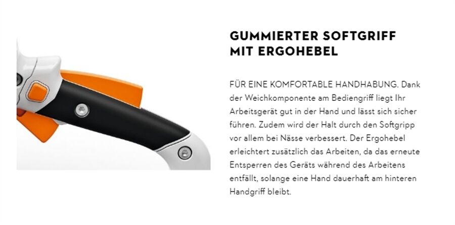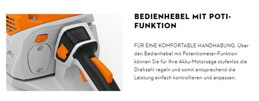 Über den Bedienhebel mit Potentiometer-Funktion können Sie bei Ihrer Akku-Motorsäge stufenlos die Drehzahl regeln. Ein Softgriff mit Ergohebel bietet Ihnen einen guten Halt, zusätzlichen Komfort und erhöht die Ergonomie. Für ein einfaches und sicheres Nachspannen der Sägekette ohne Werkzeug verfügt die Akku-Motorsäge über die STIHL Kettenschnellspannung. Die zusätzliche Kettenbremse QuickStop Super erhöht Ihre Sicherheit, da die Sägekette sofort stoppt, sobald Sie den hinteren Griff loslassen. Am transparenten Öltank haben Sie den Ölstand jederzeit im Blick.