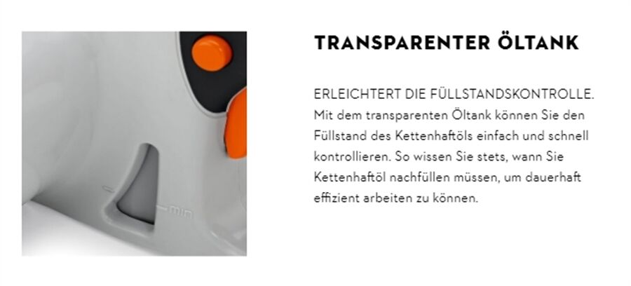 + Verlässliche Kettenölanzeige durch Tank mit transparentem Sichtfenster