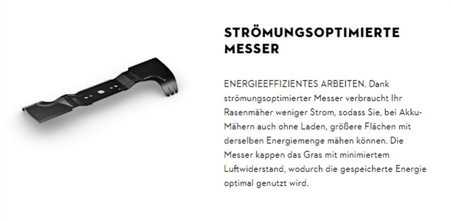 ENERGIEEFFIZIENTES ARBEITEN. Dank strömungsoptimierter Messer verbraucht Ihr Rasenmäher weniger Strom, sodass Sie, bei Akku-Mähern auch ohne Laden, größere Flächen mit derselben Energiemenge mähen können. Die Messer kappen das Gras mit minimiertem Luftwiderstand, wodurch die gespeicherte Energie optimal genutzt wird.