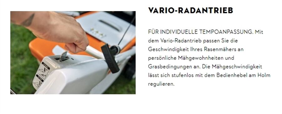 FÜR INDIVIDUELLE TEMPOANPASSUNG. Mit dem Vario-Radantrieb passen Sie die Geschwindigkeit Ihres Rasenmähers an persönliche Mähgewohnheiten und Grasbedingungen an. Die Mähgeschwindigkeit lässt sich stufenlos mit dem Bedienhebel am Holm regulieren.