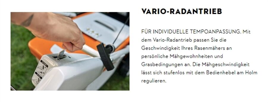 Der Akku-Rasenmäher STIHL RMA 453 PV mit Vario-Radantrieb und 51 cm Schnittbreite erleichtert Hobbygärtnern und Hobbygärtnerinnen das Mähen von mittelgroßen Rasenflächen und Hanglagen. Dabei können Sie die Arbeitsgeschwindigkeit über den Bedienhebel am Holm individuell zwischen 0 km/h und 4,6 km/h einstellen. Dank seiner sequenziellen Entladung sorgt der RMA 453 PV außerdem dafür, dass automatisch auf den zweiten mitgeführten Akku aus dem STIHL AP-System umgeschaltet wird, sobald der erste leer ist. Das manuelle Wechseln der Akkus entfällt somit und Sie können auch sehr effizient größere Rasenflächen mähen. Besitzen Sie noch keine Akkus aus dem STIHL AP-System, empfiehlt es sich, den STIHL RMA 453 PV direkt im Set zu kaufen. Das Set beinhaltet einen Akku STIHL AP 30 und das Schnellladegerät STIHL AL 301.Dank serienmäßiger Ausstattung mit Multi-Messer, integrierter Mulchfunktion und Seitenauswurf eignet sich dieser Rasenmäher sowohl zum Mähen als auch zum Mulchen. Das Schnittgut können Sie entweder direkt fangen oder über den Seitenauswurf auf dem Rasen verteilen. Der klappbare und höhenverstellbare Komfortlenker sorgt für eine angenehme und ergonomische Führung des Rasenmähers. Mit der zentralen Schnitthöhenverstellung stellen Sie die Wunschlänge Ihres Rasens in 7 Stufen von 20 mm bis 100 mm ein. Der klappbare 55 l Grasfangkorb nimmt jede Menge Schnittgut auf und ist leicht zu entleeren.In unserer Übersicht zu den STIHL Akku-Lauf- und Ladezeiten können Sie sehen, wieviel Rasenfläche Sie mit einer Akkuladung Ihres STIHL Akku-Rasenmähers RMA 453 PV im Set mit Akku AP 30 und Schnellladegerät AL 301 bearbeiten können und wie lange der eingesetzte Akku zum Laden benötigt.Hinweis: Der Akku AP 30 ist nach IPX4 Schutzart zertifiziert.