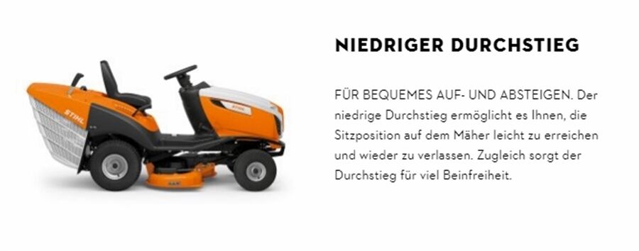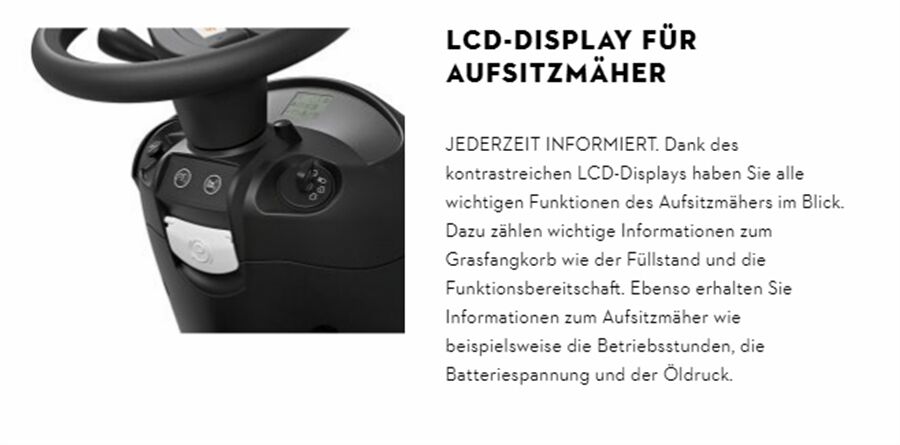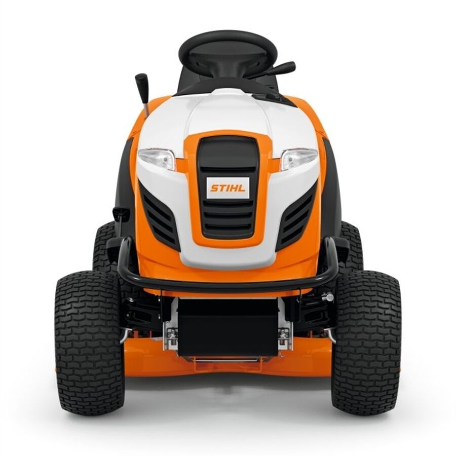Das auch bei Sonnenlicht gut wahrnehmbare LCD-Display zeigt alle wichtigen Informationen von der Batteriespannung über den Tankfüllstand bis zur Öldruckkontrolle auf einen Blick. Der Komfort wird durch den gefederten und verstellbaren Sitz sowie den niedrigen Durchstieg erhöht. Turf-Reifen und die nachrüstbare Mulchfunktion dank STIHL Mulch-Kit runden den Leistungsumfang dieses Rasentraktors ab.