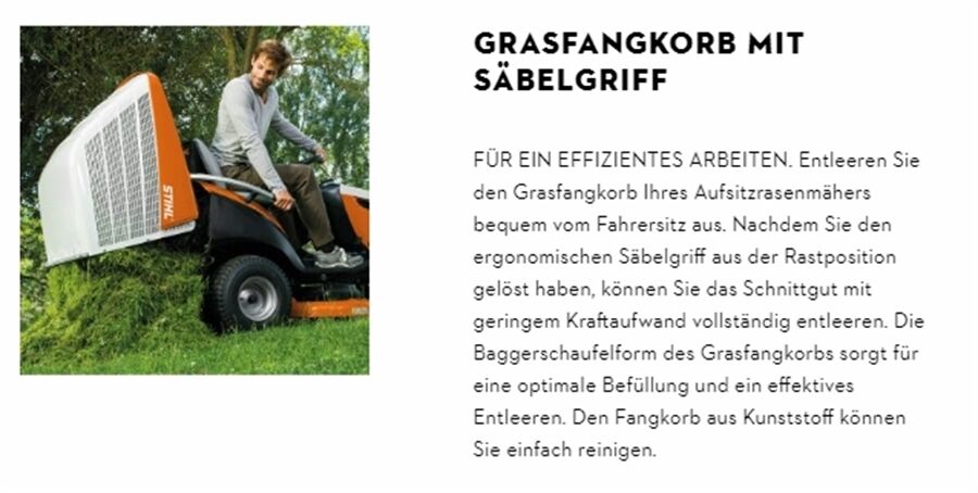 Zudem besitzt der Aufsitzrasenmäher STIHL RT 6112 ZL einen Tempomat, der per Knopfdruck zugeschaltet werden kann und bei länger andauernden Arbeiten für Entlastung sorgt. Sie können damit die Geschwindigkeit fixieren und so vor allem bei großen Flächen entspannt den Rasen mähen. Damit Sie möglichst lange unterbrechungsfrei arbeiten können, verfügt der Rasentraktor RT 6112 ZL über einen 350-l-Grasfangkorb, der sich bequem per Säbelgriff vom Fahrersitz aus entleeren lässt.